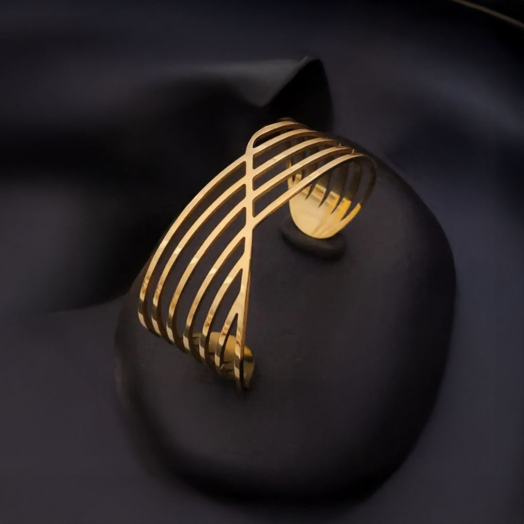 Crafted in premium stainless steel with radiant gold plating, this cuff offers lasting brilliance, durability, and tarnish resistance. Its free-size, adjustable fit ensures comfort while making a striking impression with every wear.