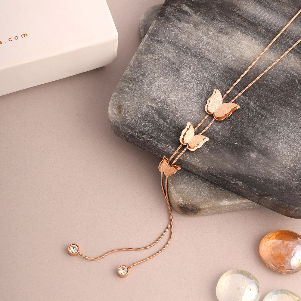 Embrace a whimsical touch with our Fluttering Elegance Necklace in rose gold. This exquisite piece features three beautifully crafted flying butterfly pendants, showcasing a modern and elegant design. Made from premium stainless steel, it combines style and durability, making it a charming accessory that enhances any outfit.