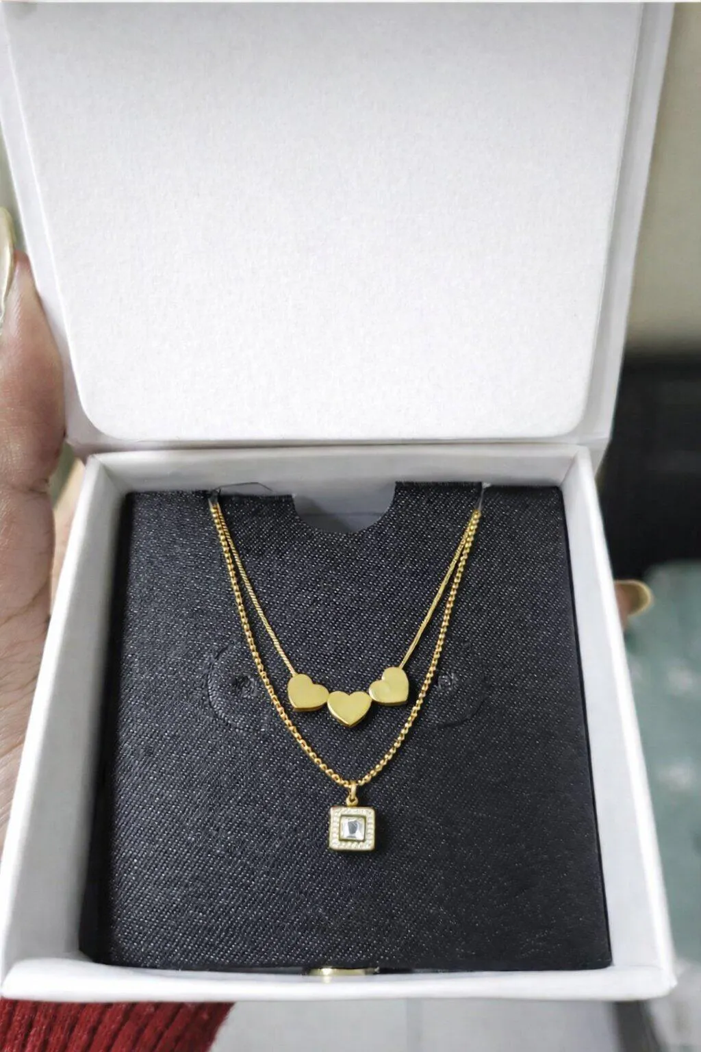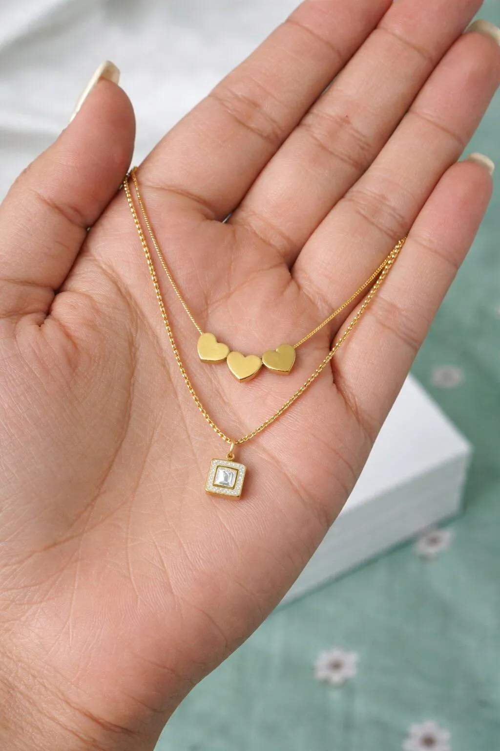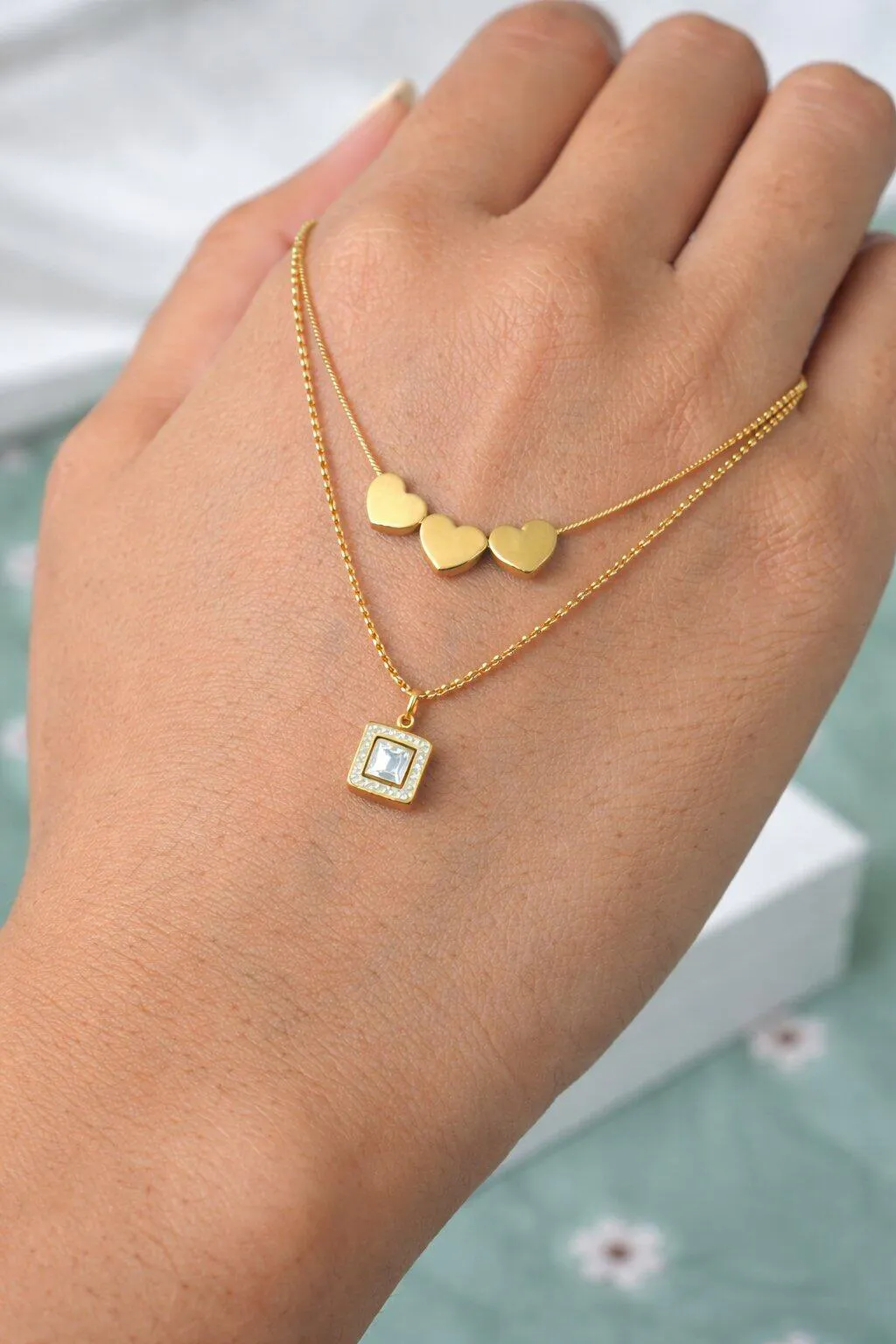Illuminate your style with our Heartbeats and Shimmers Necklace. This exquisite double-layer design features three small, elegant hanging hearts on the first layer and a stunning square pendant adorned with sparkling stones on the second. Crafted from premium gold-toned stainless steel, it adds a touch of sophistication to any outfit.
