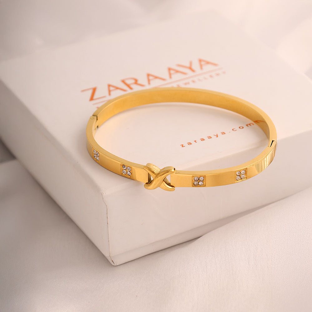 Elevate your accessory collection with our Interlocked Gold Bangle Kada. Featuring a modern design with elegantly interlocked bands, this gold-toned bangle exudes sophistication and style. Crafted from premium stainless steel, it combines durability with a trendy aesthetic, making it the perfect statement piece for any occasion.